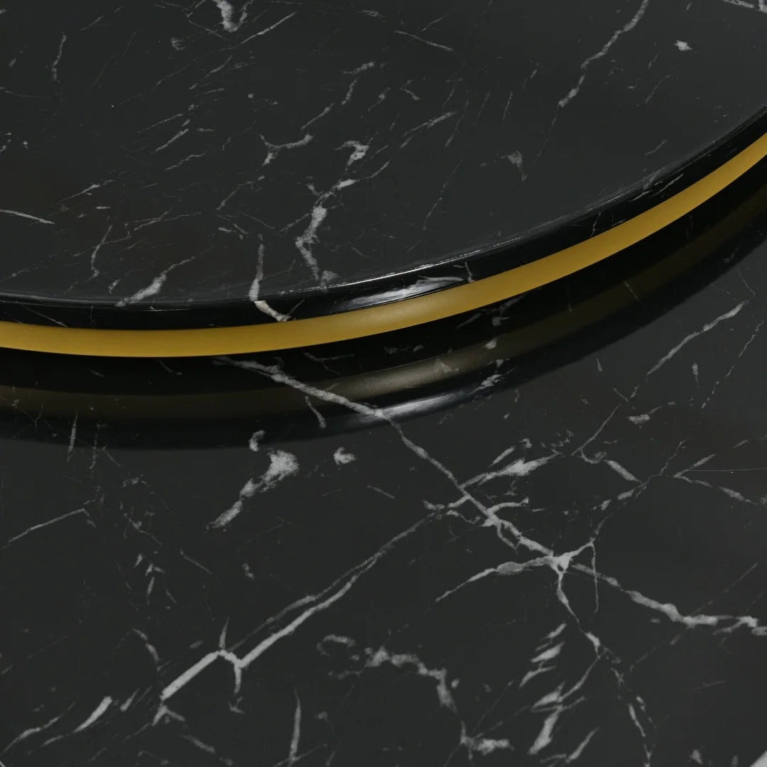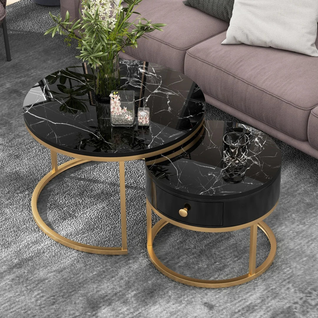Round Coffee Table Set – Black – Marble Look – 2-Piece – Gold Frame