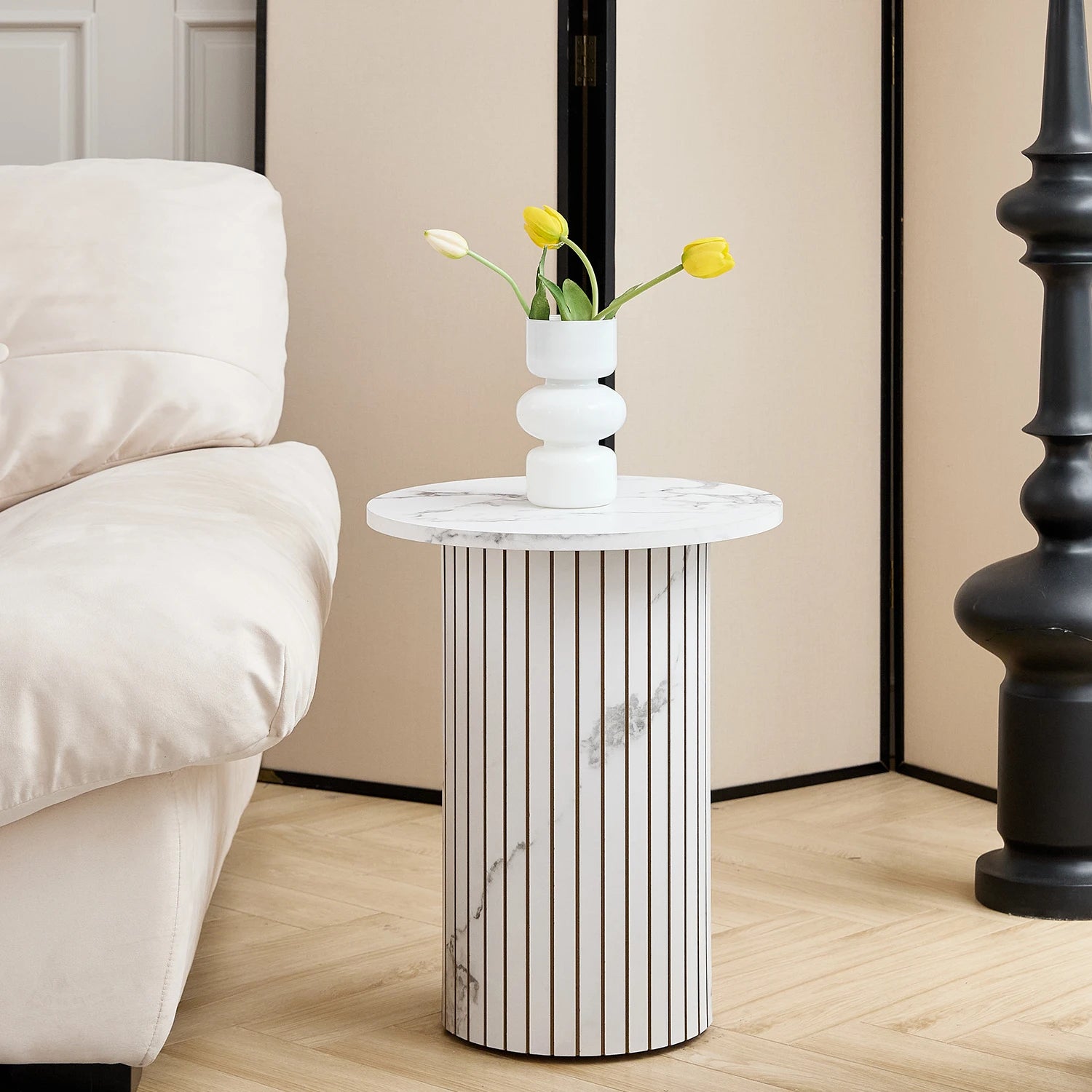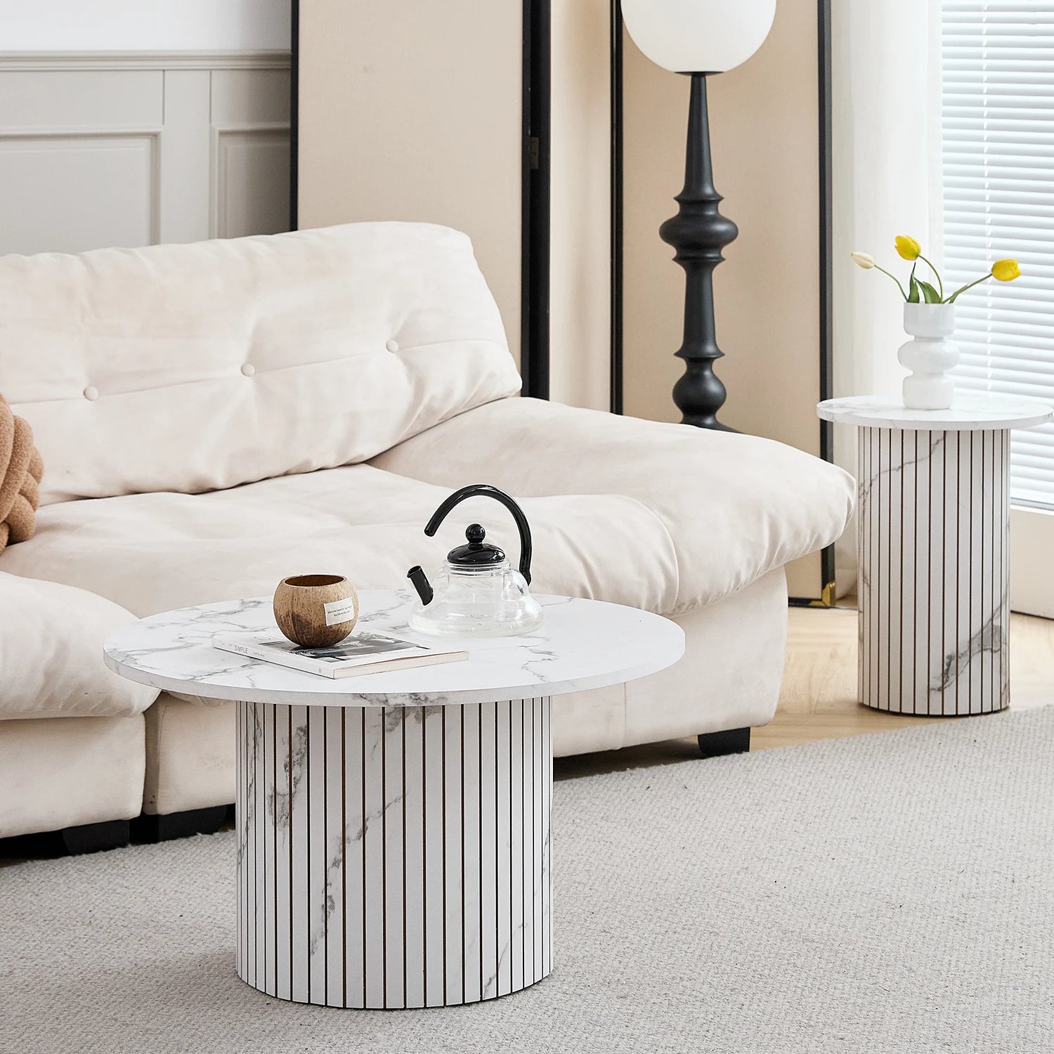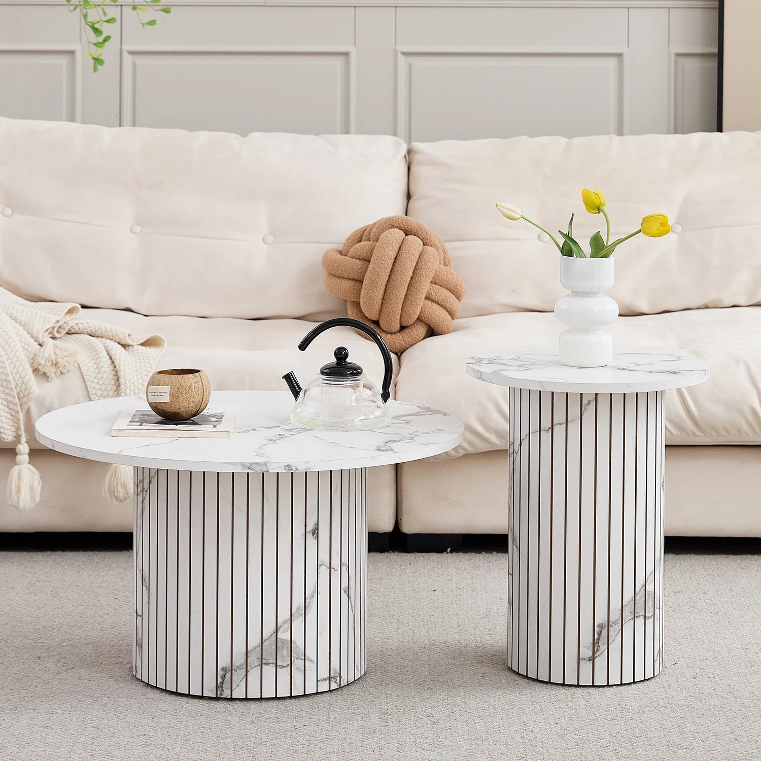 This set of two round tables combines a minimalist design with a warm wood or elegant marble look. The simple silhouette fits perfectly into modern, Scandinavian, and contemporary interiors.