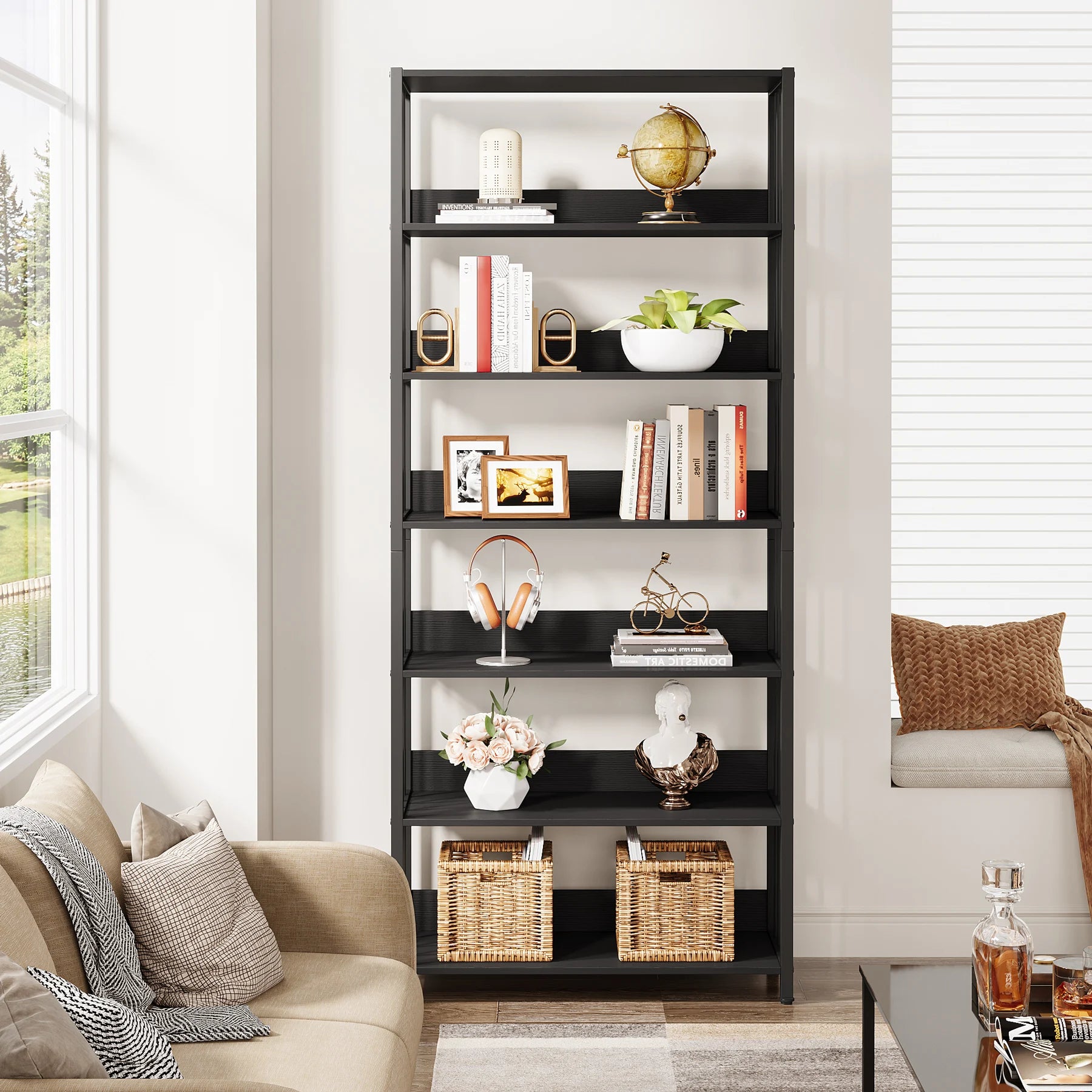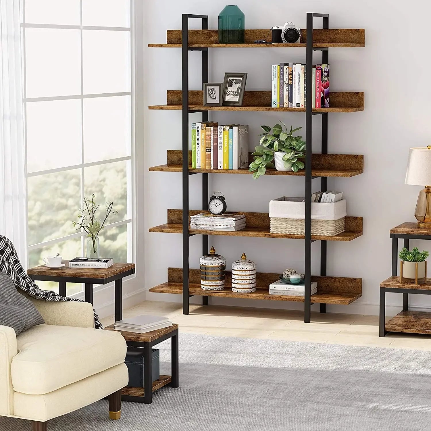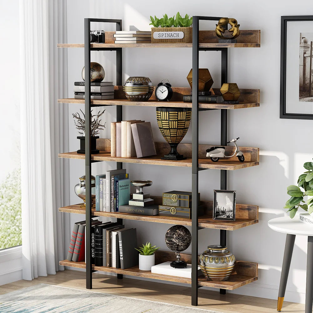 The wood-look shelves combined with the black metal frame create a cool, industrial aesthetic.