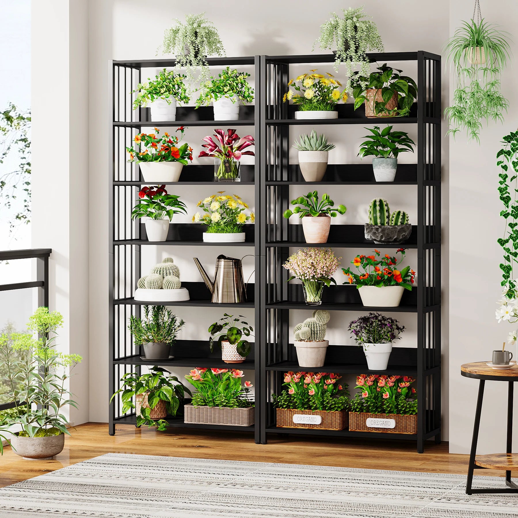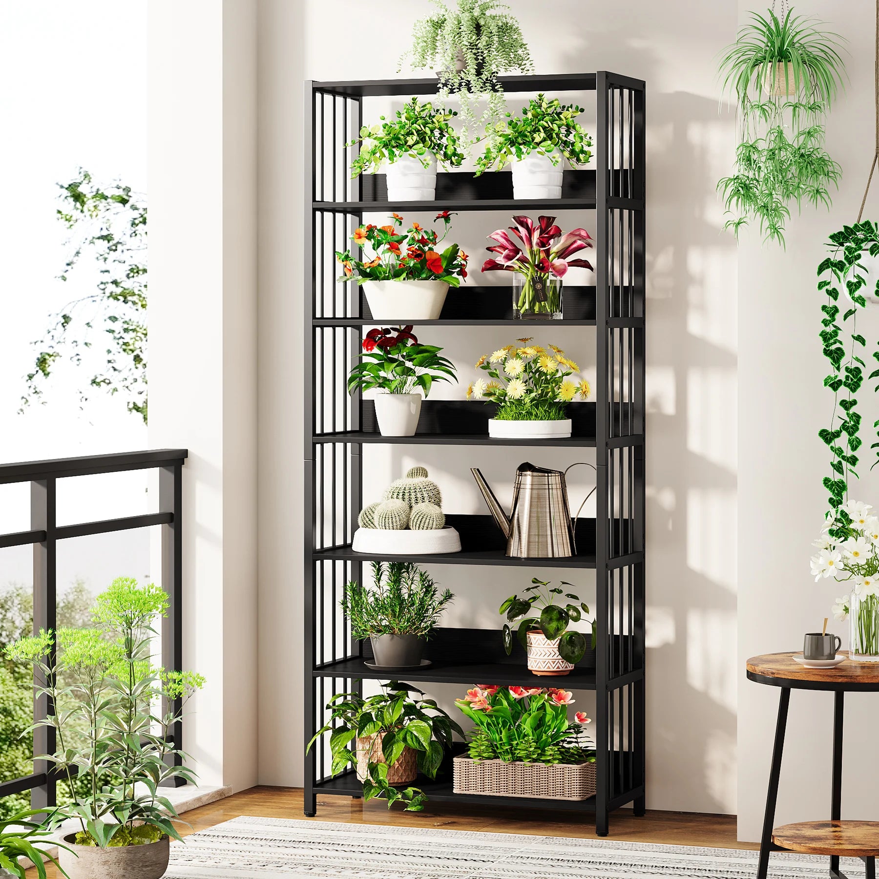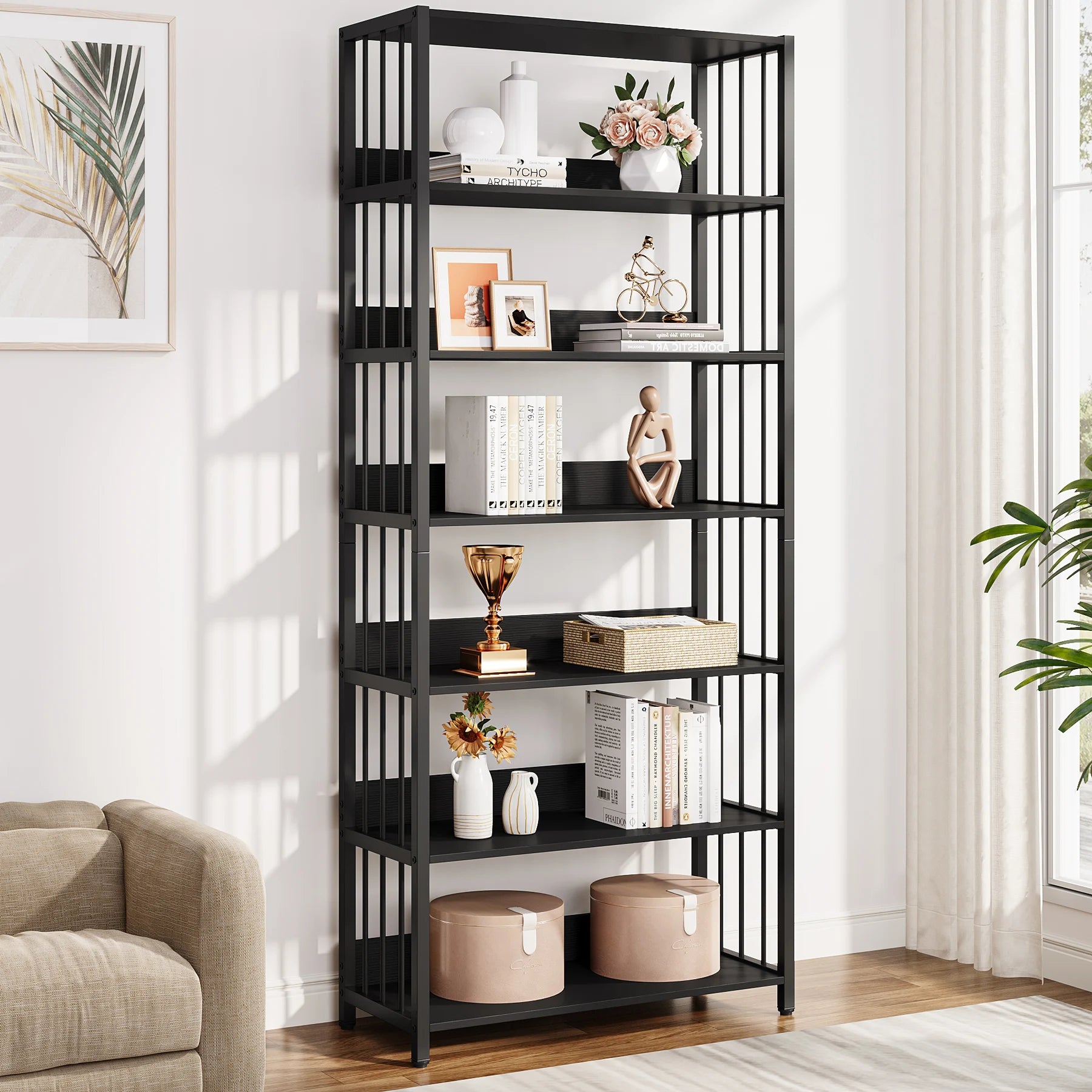 The wood-look shelves combined with the black metal frame create a cool, industrial aesthetic.